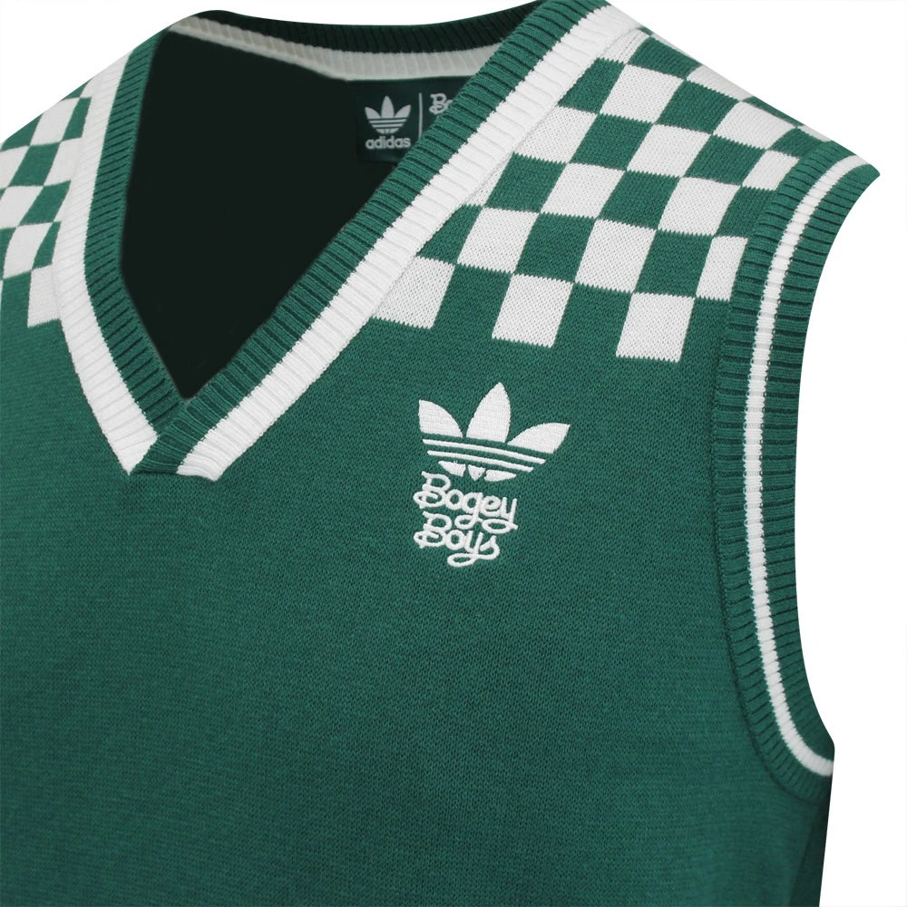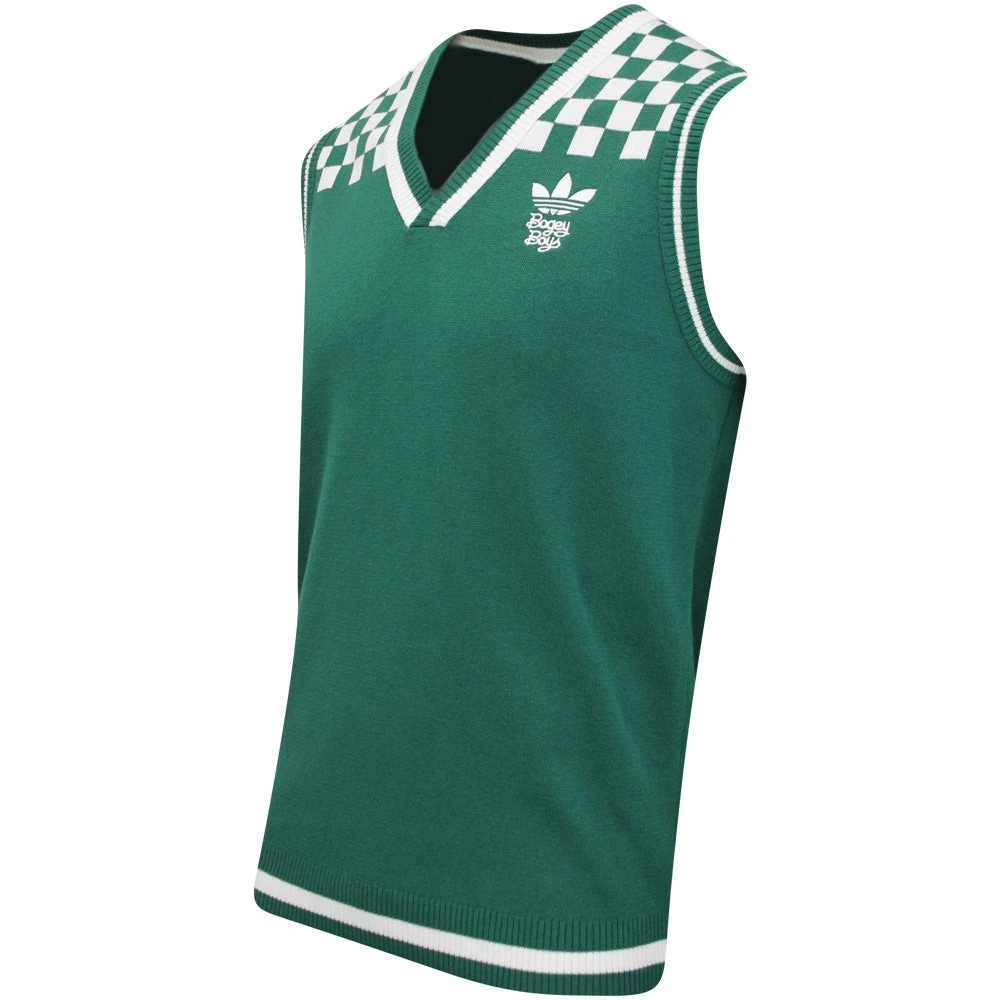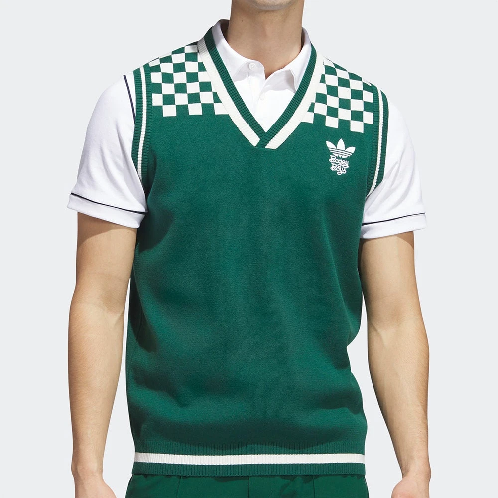 We love to see adidas collaborating with other upcoming golf fashion brands and this limited edition style has arrived from the highly anticipated adidas Originals x Bogey Boys capsule. This V Neck sweater vest makes use of a soft & cosy fabric – while the rib knit neckline & armholes provide comfort where you need it most. Collaborative branding featuring both the Trefoil & Bogey Boys logo is located on the chest – while the green & white checkerboard pattern provides a truly distinctive aesthetic for layering your looks. “Bogey Boys” is a golf clothing brand founded by rapper, singer, songwriter, global superstar & golf obsessive Macklemore – so you can be sure that this Originals x Bogey Boys golf mid layer will keep you looking fly & feeling legit on the golf course this season.