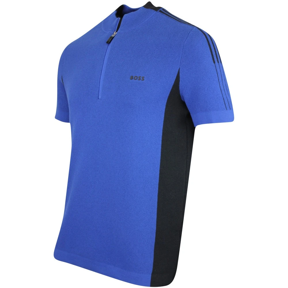 This quarter zip BOSS Golf jumper is new from the Fall ’23 collection and features all the key attributes that you would expect from a top quality BOSS knitwear style – this time upon a short sleeve silhouette for a unique look. The seasonal colour combination is enhanced with tonal detailing which adds some visual interest at the sides – while the signature BOSS logo is located at the left chest. The naturally high stretch level ensures freedom of movement, while high quality cotton fabric is perfect for wearing both on and off the golf course. Another winning knitwear style from BOSS Golf which is a must have for 2023 – perfect for wearing on its own or as a stylish layering piece this season.