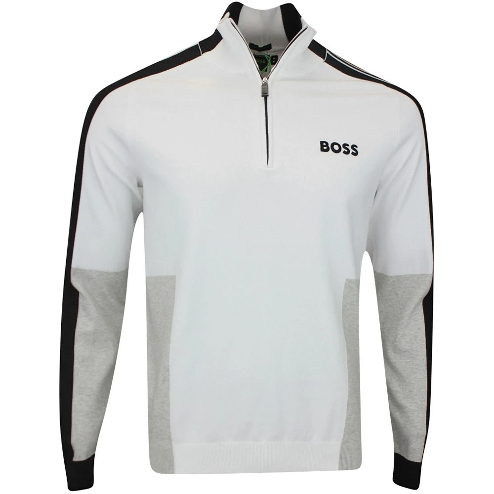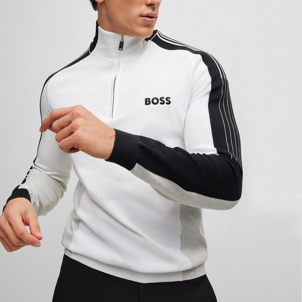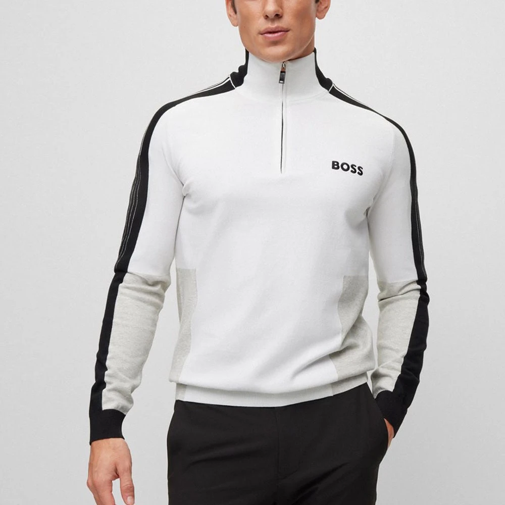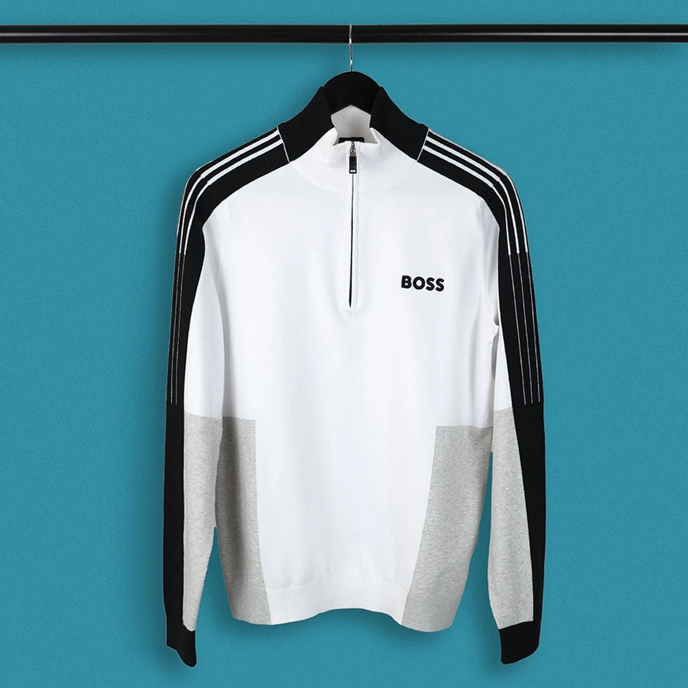This brand new BOSS Golf jumper is a welcome addition to the Fall ’23 collection and features all the key attributes that you would expect from a BOSS “Pro” edition knitwear style. It embraces a colour blocked design with multi stripe detailing at the shoulders & sleeves, a unique look which is especially effective in this colour combination and would suit perfectly both on and off the golf course this season. The invisible DWR coating on the fabric ensures longevity and functionality in a light rain shower, while the lightly ribbed hem and cuffs ensures an immaculate fit. Another excellent knitwear style which would be a worthy addition to your collection this season.