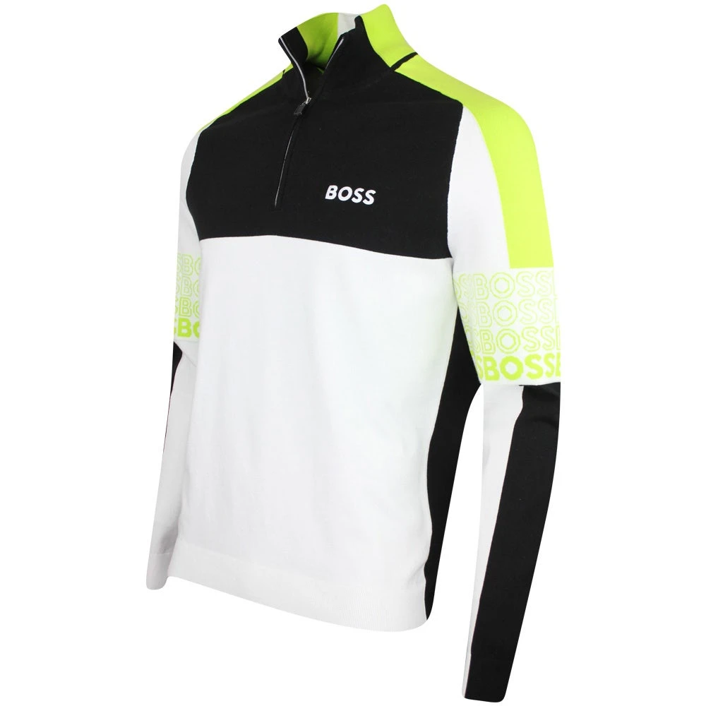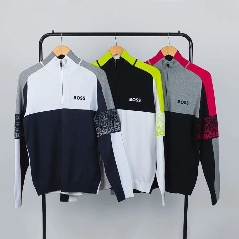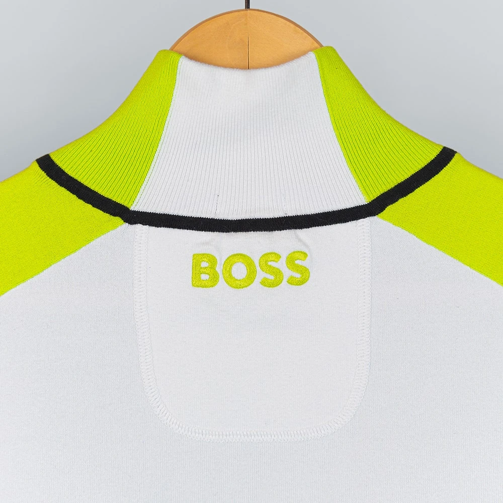 This brand new BOSS Golf jumper is a welcome addition to the Spring ’23 collection and features all the key attributes that you would expect from a BOSS “Pro” edition knitwear style. It features a unique colour blocked design with repeating logo detailing on the sleeves, a style which is especially effective in this colour combination and would suit perfectly both on and off the golf course this season. The invisible DWR coating on the fabric ensures longevity and functionality in a light rain shower, while the lightly ribbed hem and cuffs ensures an immaculate fit. Another excellent knitwear style which would be a worthy addition to your collection this season.