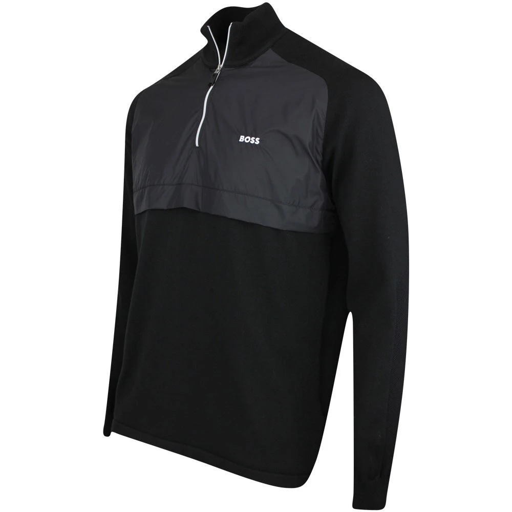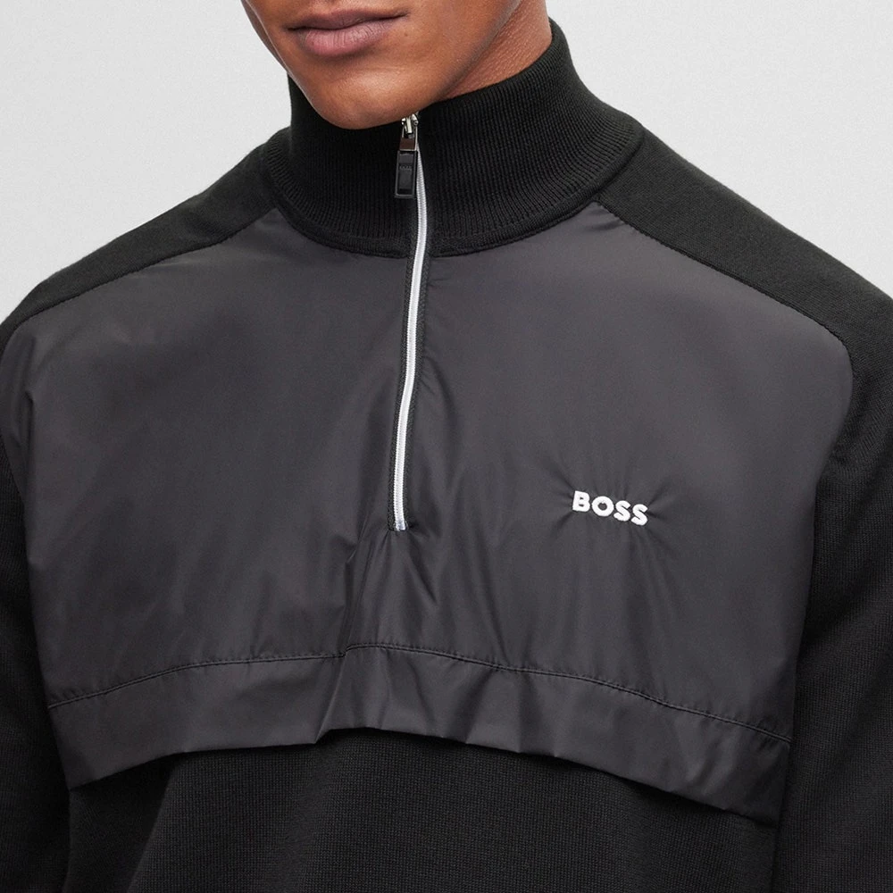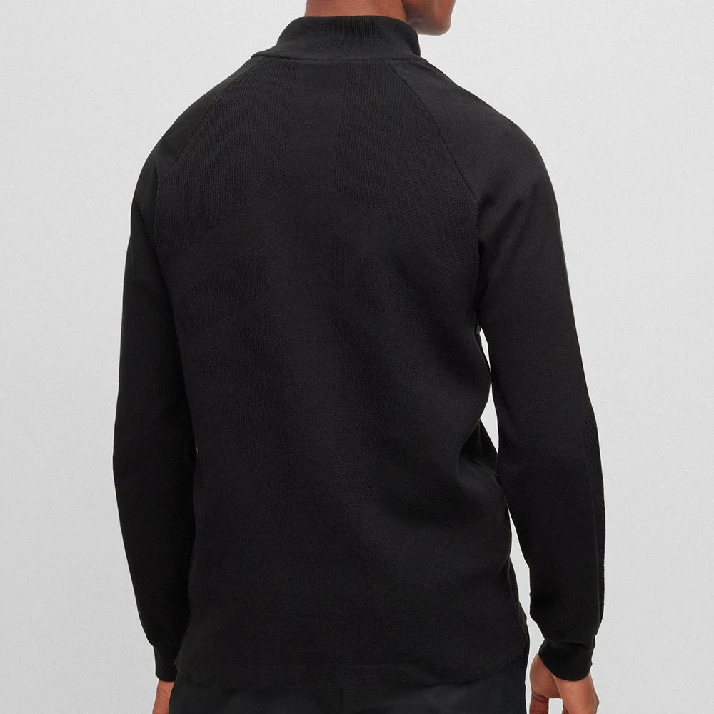 This outstanding pullover is what we like to call a “Hybrid” style which lays somewhere between a traditional quarter zip sweater & an outerwear piece – thanks to the two contrasting fabric types used. The woven panel at the chest area is a soft shell fabric which will provide enhanced warmth through wind protection with a water repellent finish – while the body, sleeves & rear make use of a knitted quality fabric for soft, flexible comfort. Further ergonomic detailing is featured in key areas for freedom of movement where you need it most, while the moisture wicking properties will also leave you feeling dry & comfortable on the inside. Another outstanding knitwear hybrid pullover from BOSS for Spring ’23.