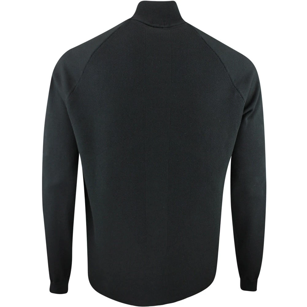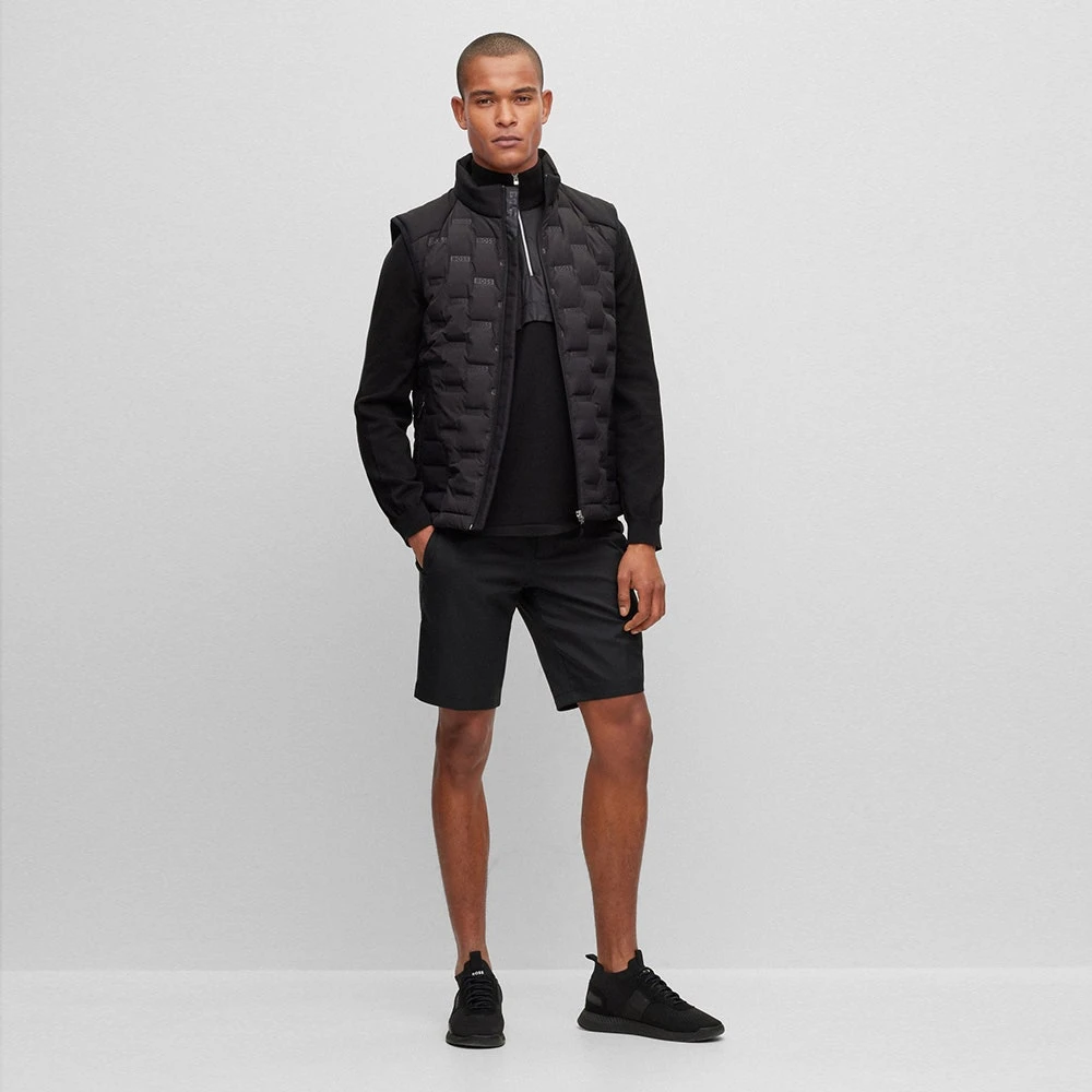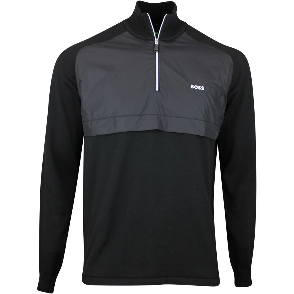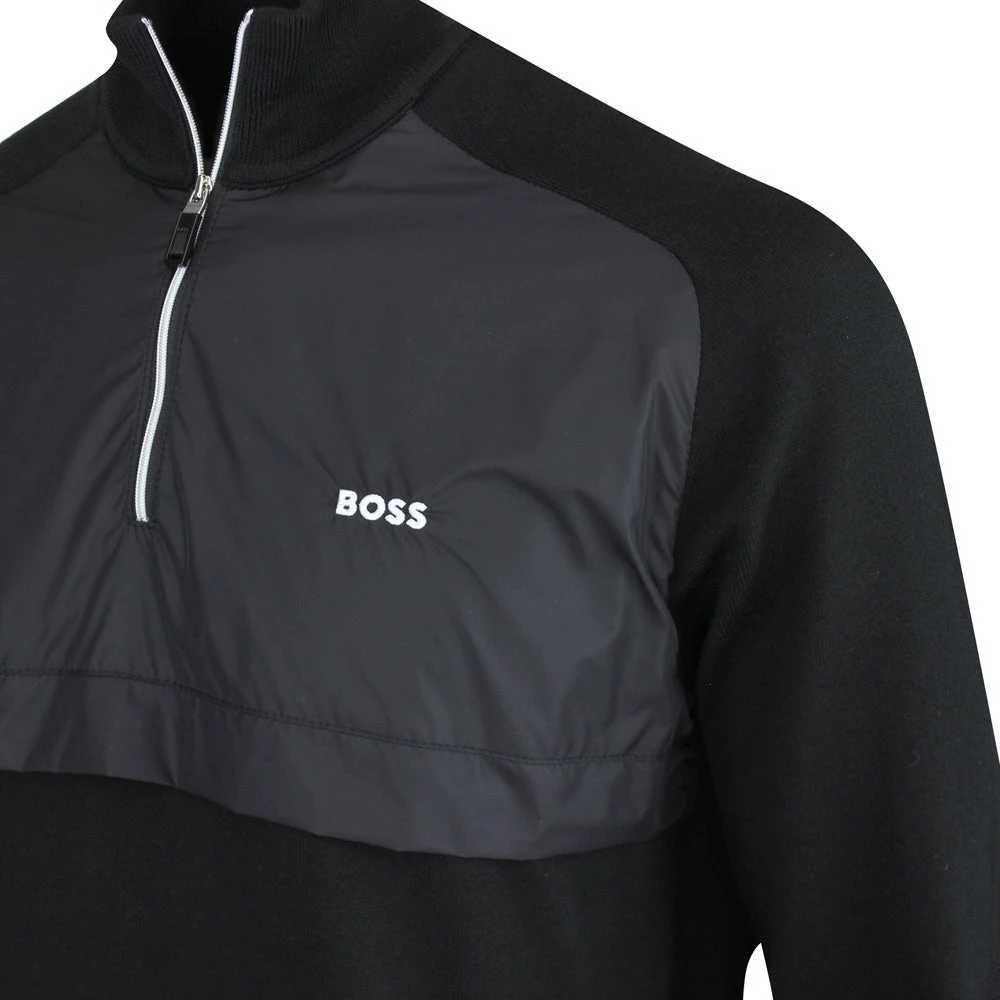 This outstanding pullover is what we like to call a “Hybrid” style which lays somewhere between a traditional quarter zip sweater & an outerwear piece – thanks to the two contrasting fabric types used. The woven panel at the chest area is a soft shell fabric which will provide enhanced warmth through wind protection with a water repellent finish – while the body, sleeves & rear make use of a knitted quality fabric for soft, flexible comfort. Further ergonomic detailing is featured in key areas for freedom of movement where you need it most, while the moisture wicking properties will also leave you feeling dry & comfortable on the inside. Another outstanding knitwear hybrid pullover from BOSS for Spring ’23.