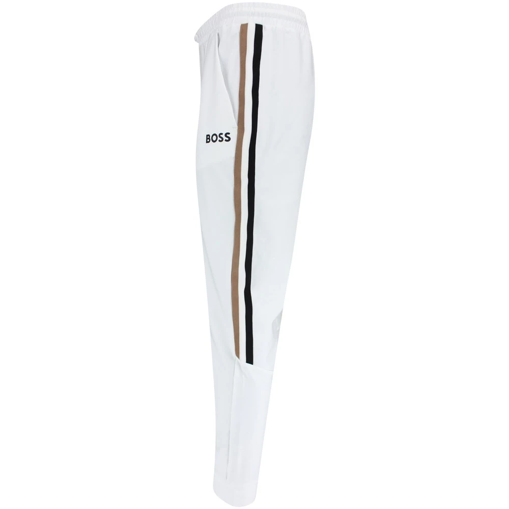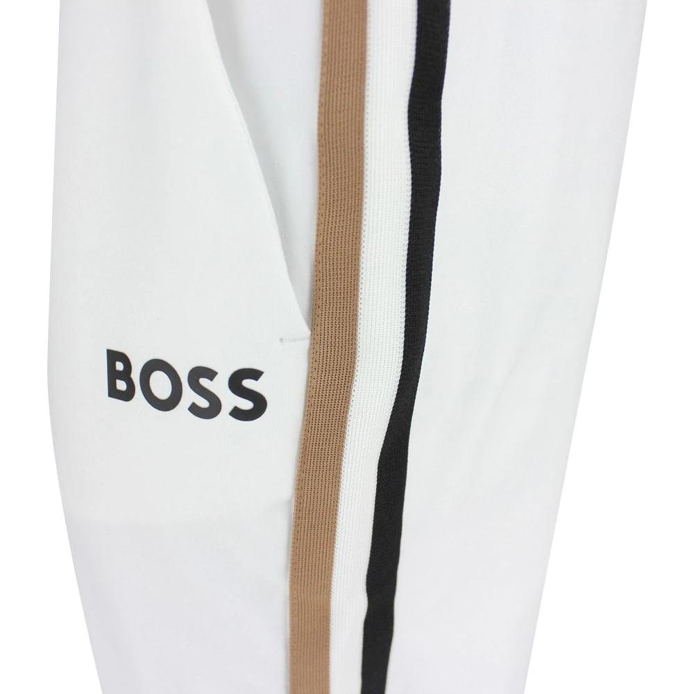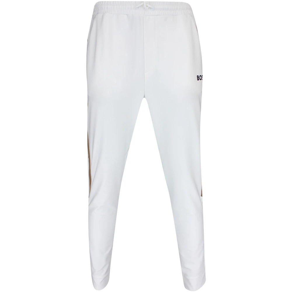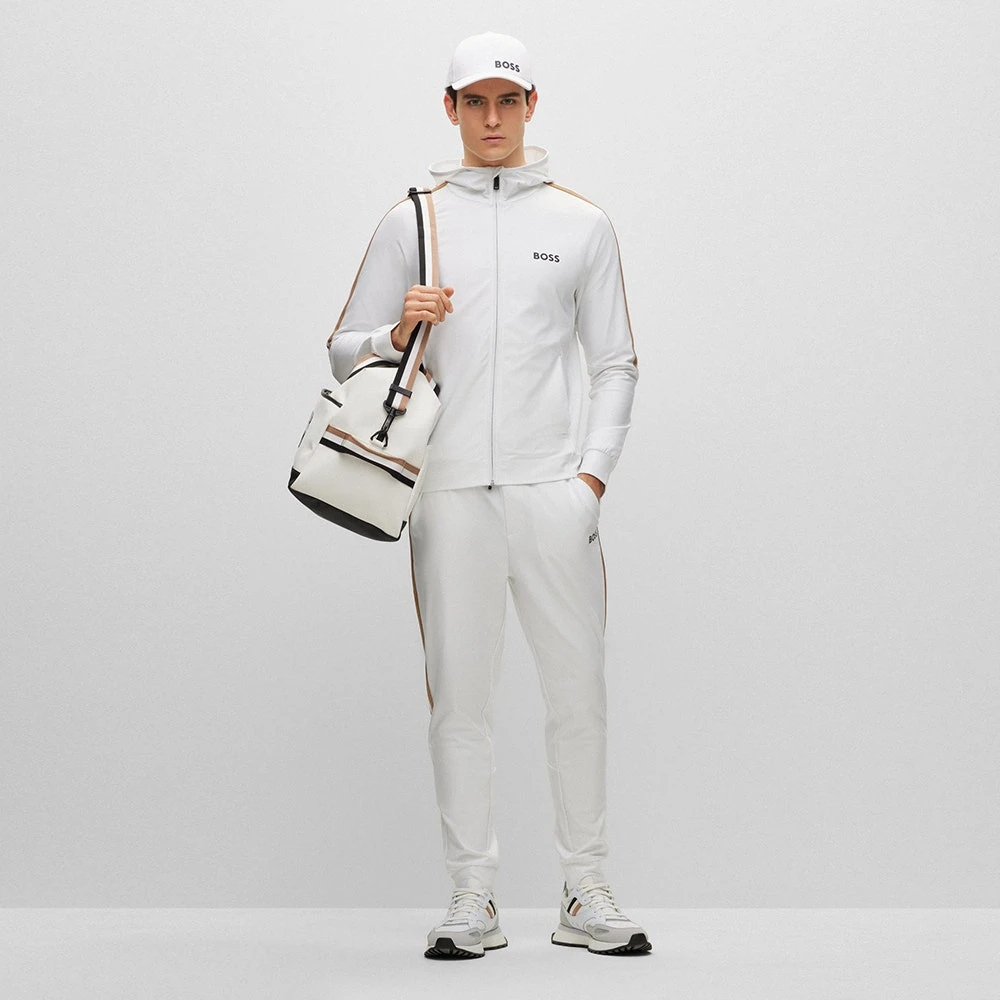 These brand new BOSS sweatpants come from the limited edition Matteo Berrettini capsule and look ultra sporty in this iconic colour combination. The contrast logo couples well with the tri-colour stripe detailing at the outside legs, while the sporty look is rounded off perfectly by the cuffed ankles. The fabric is soft, stretchy & technical – providing both comfort & performance through the moisture wicking capabilities. Look out for the matching Sicon MB 1 full zip hoodie to complete the co-ord look this season.