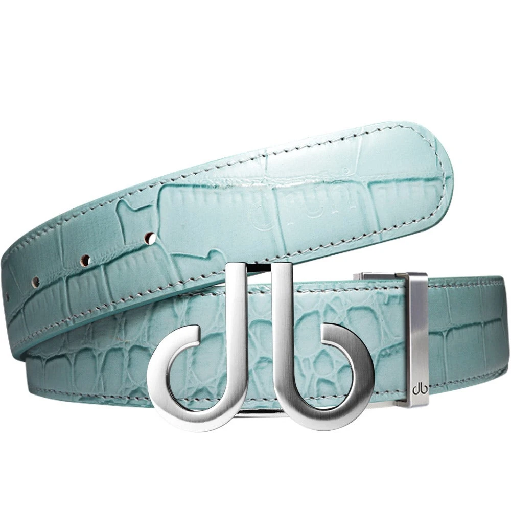 Crocodile textured leather golf belts are incredibly popular from Druh and we love this new Tour Collection style, finished in light aqua blue. This Tour golf belt is one size fits all and also comes with two interchangeable belt buckles – simply remove the buckle and trim the leather strap to the exact size you require.