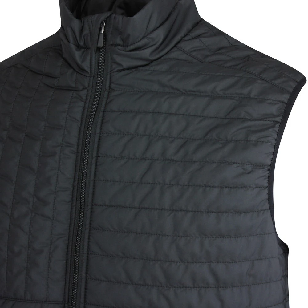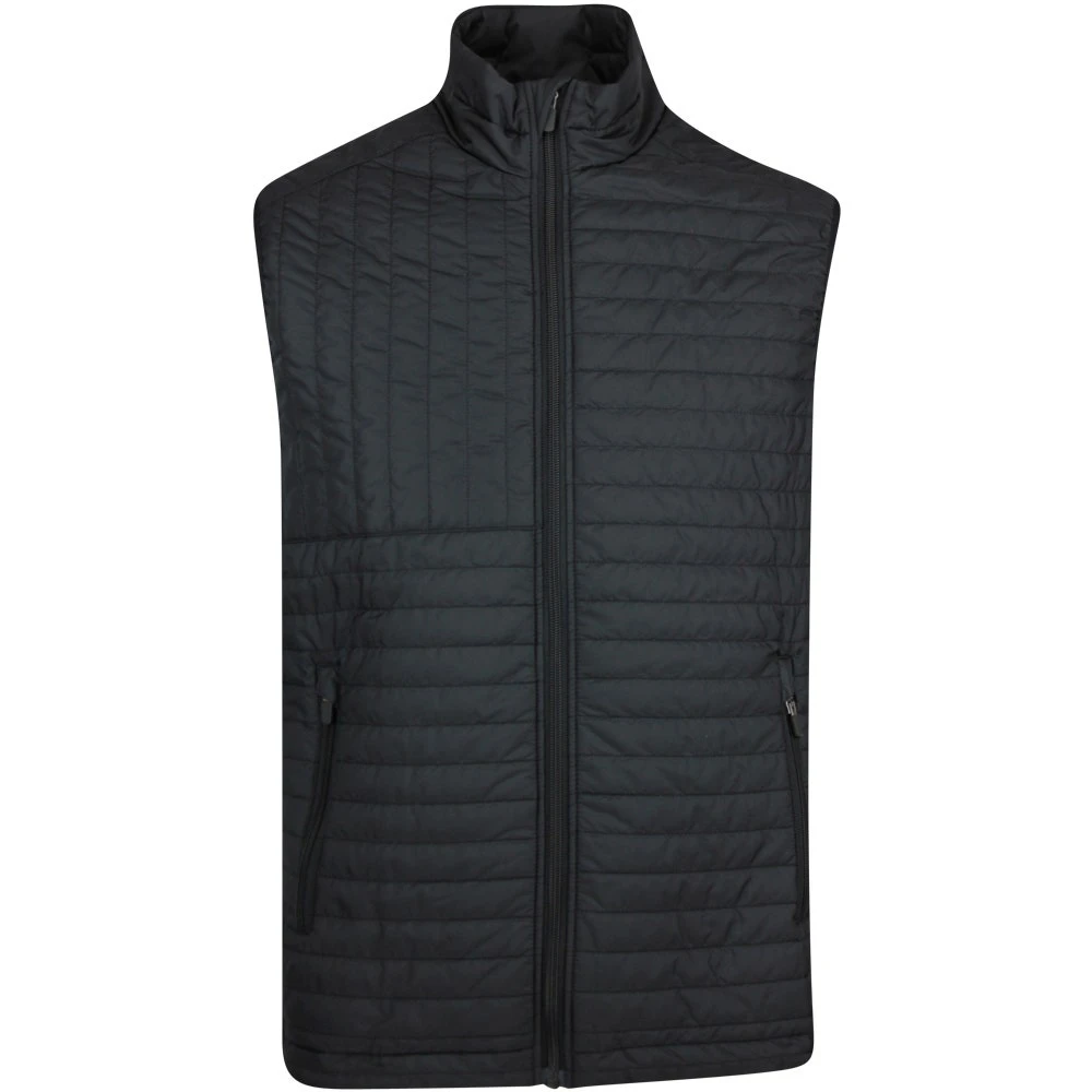 Interface-1 golf outerwear styles make use of a proprietary soft shell fabrication which has been especially developed for complete wind proof protection and reliable water resistance. This particular quilted gilet style also boasts Primaloft insulation for added warmth, while still providing a relatively high level of water repellent protection. The comfort factor is increased as the internal backer is designed to slide & glide over any other garments worn beneath. The timeless styling allows for effortless layering of outfits, while the elasticated arm holes and drawstring at the waist ensure a perfect fit.
