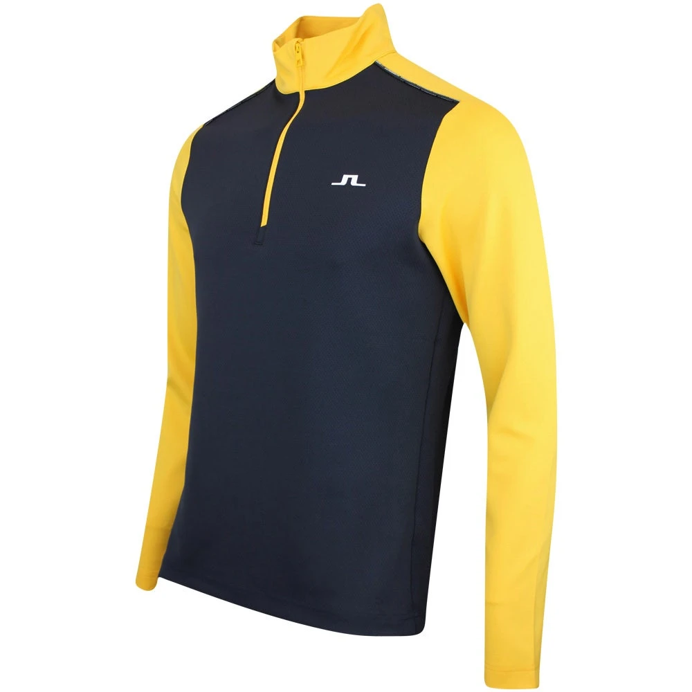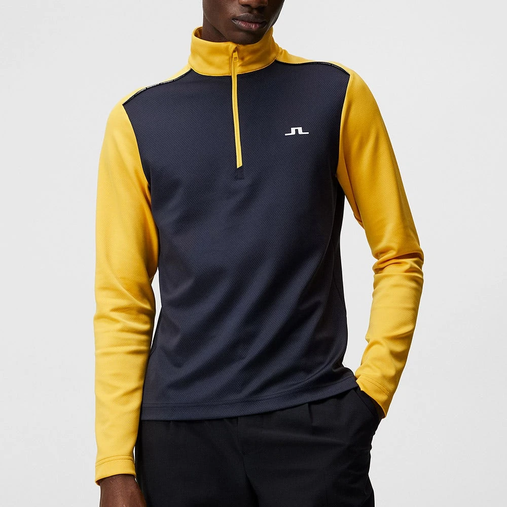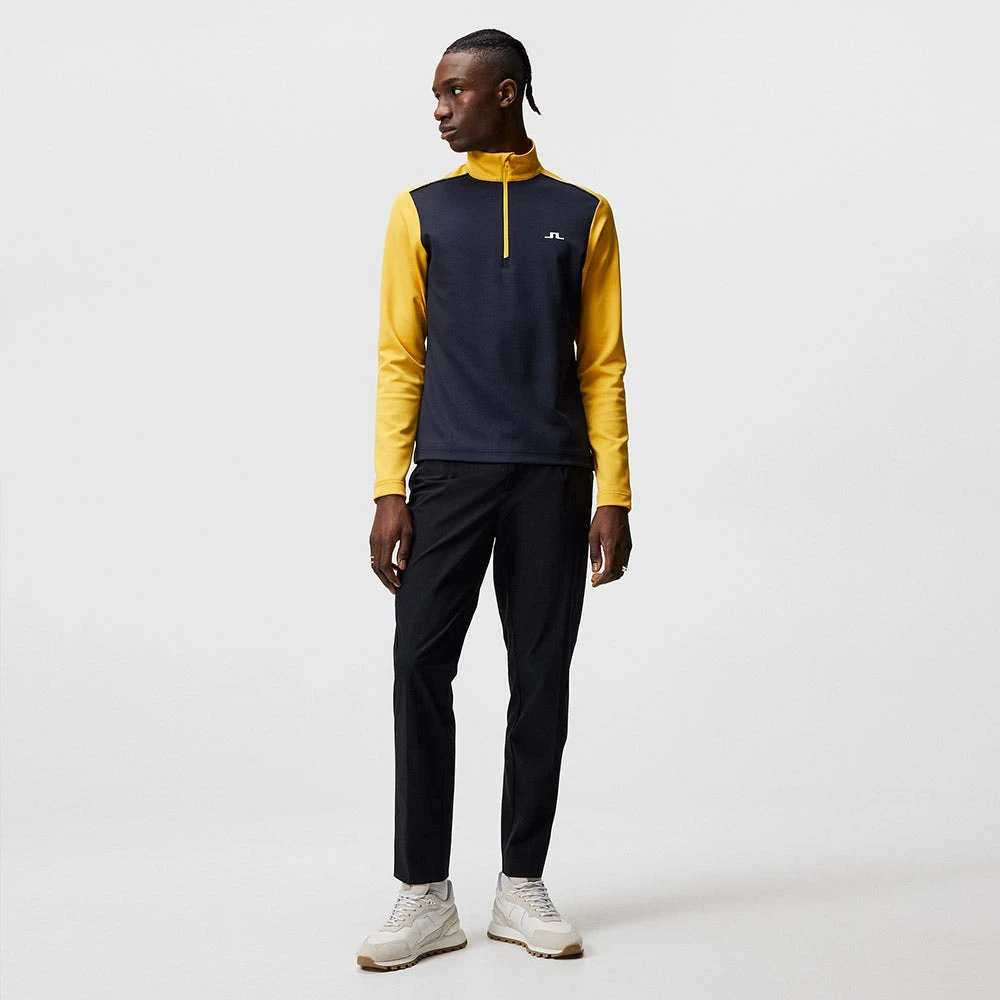 This high performance pullover is a brand new style which comes from the J.Lindeberg collection for SS23 and offers both performance & style appeal for on the course this season. That’s because it makes use of the signature Tech Mid fabric which features a structured interior to create pockets of air for improved heat retention, all without adding bulk to the garment itself. The colour blocked design looks ultra fresh in this colour combination, while the 3D raised pipe decoration at the shoulders elevates the style appeal once more. A traditional quarter zip placket adds to the sporty look and helps to make this one of our favourite JL Mid Layers right now.