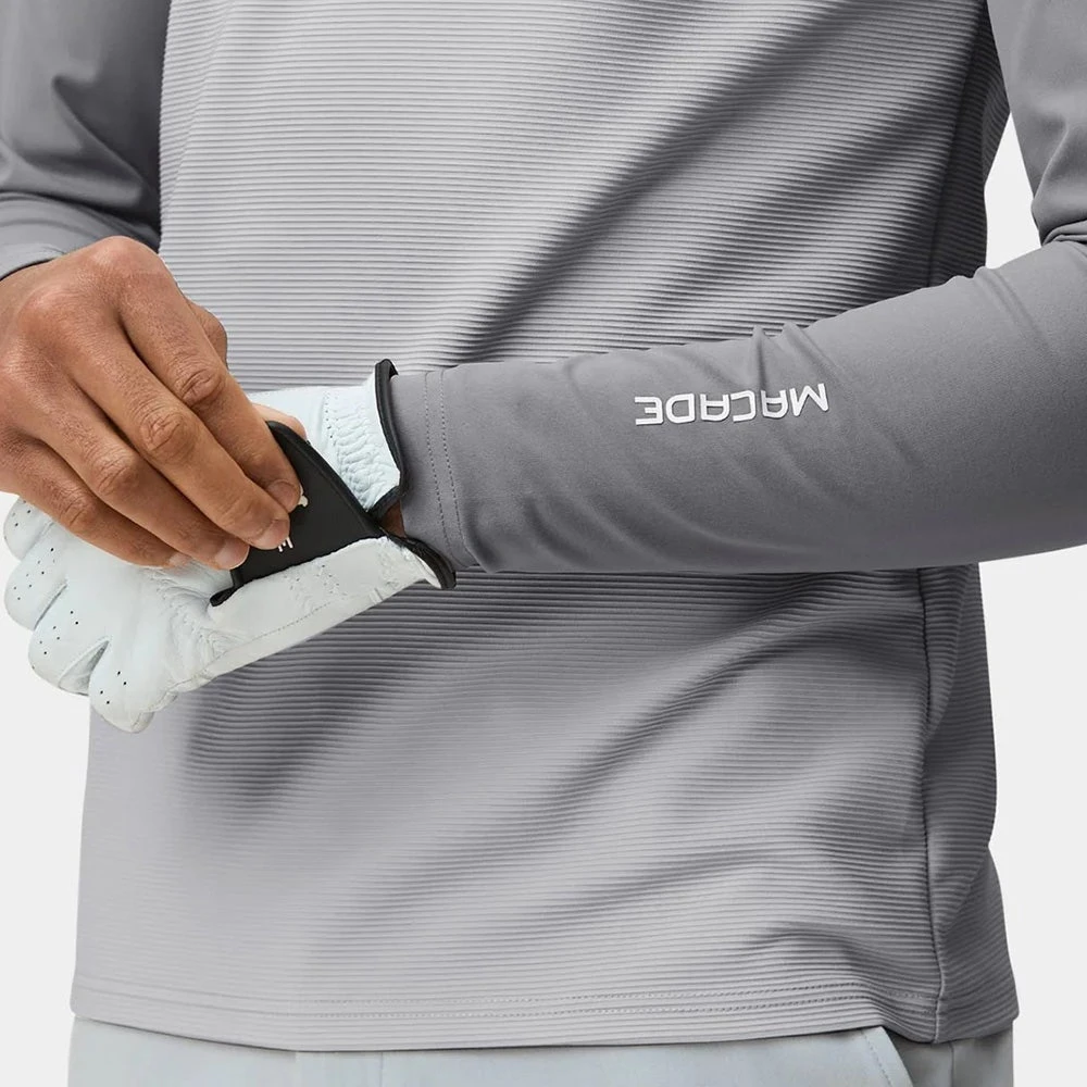 Macade Golf is one of the newest brands in the game which is worn on tour by the likes of Garrick Higgo, Lucas Bjerregaard & Alex Noren. This new Tech Quarter Zip features two different fabric types for both style & function – complete with Macade tour branding at the left sleeve. The unique, textured fabric through the body will provide core warmth and a degree of protection in a light rain shower, while the midweight jersey sleeves are highly flexible with a raglan construction for complete freedom of movement through the golf swing. Narrow cuffs provide an immaculate fit, while the flat collar shape also allows for effortless layering. A highly technical and visually unique mid layer style which is well worth picking up this season.