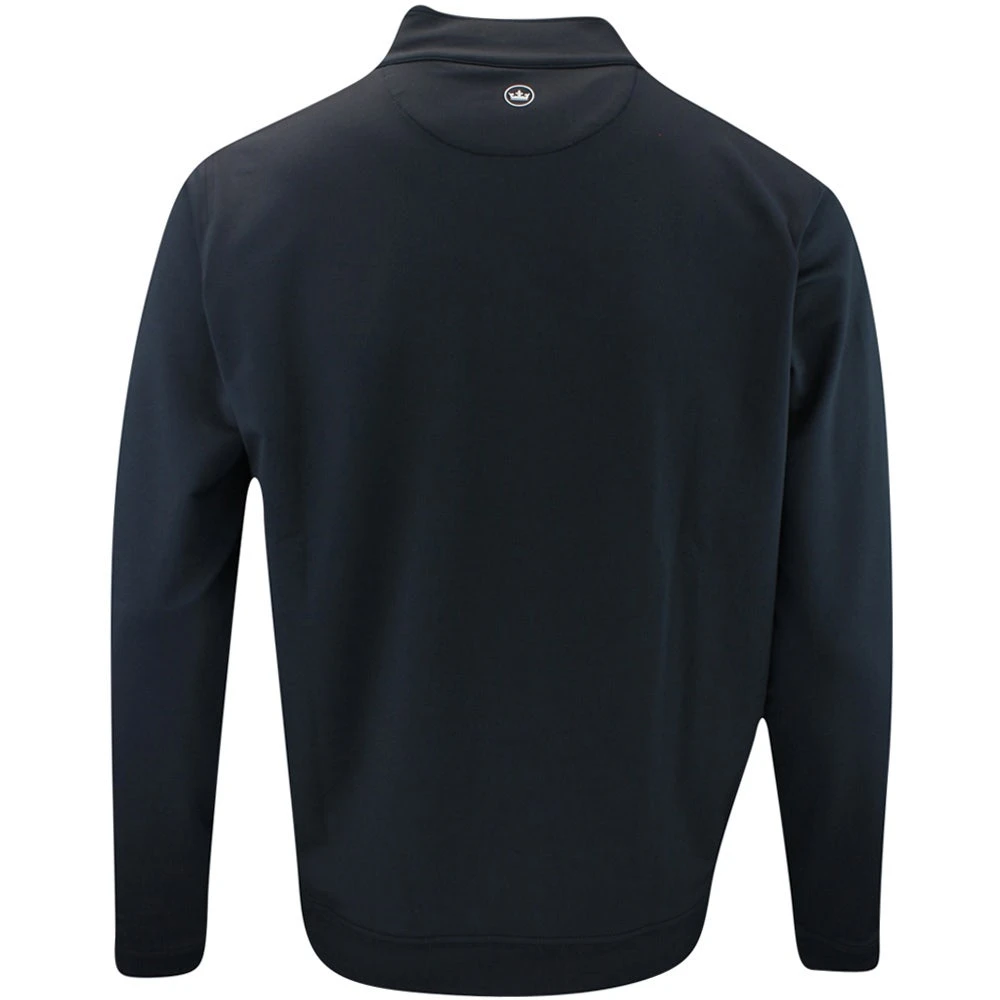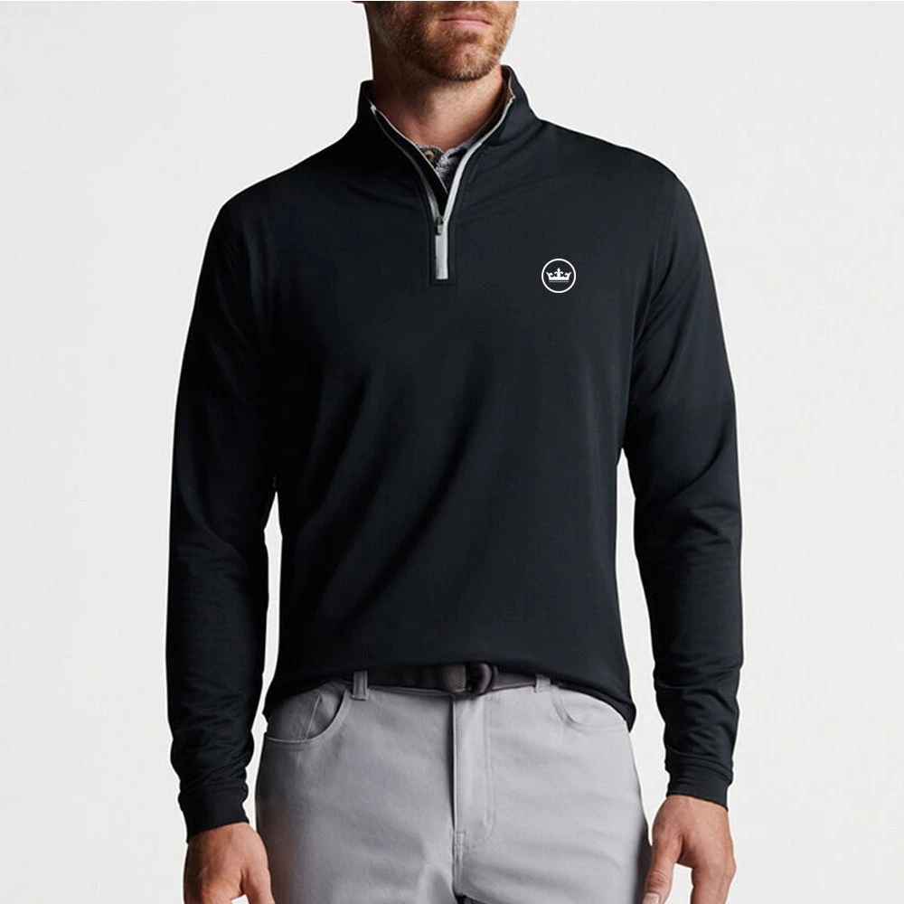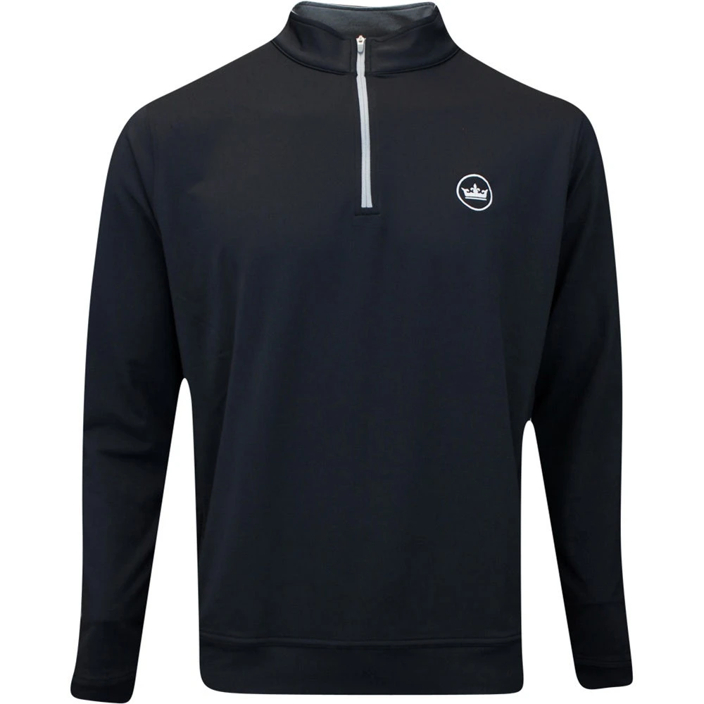 This performance mid layer sweater comes from the Peter Millar golf clothing collection and has been designed for wearing both on and off the course with ease. The soft jersey fabric has a high degree of stretch with moisture wicking capabilities, while the quarter zip silhouette is a timeless design which is perfect for layering your look. Warmth, comfort and performance are all assured – while you can also find the tour sized Peter Millar “Crown Seal” logo embroidered at the left chest. A tried & tested mid layer style which is both fashionable and timeless in this colour combination.