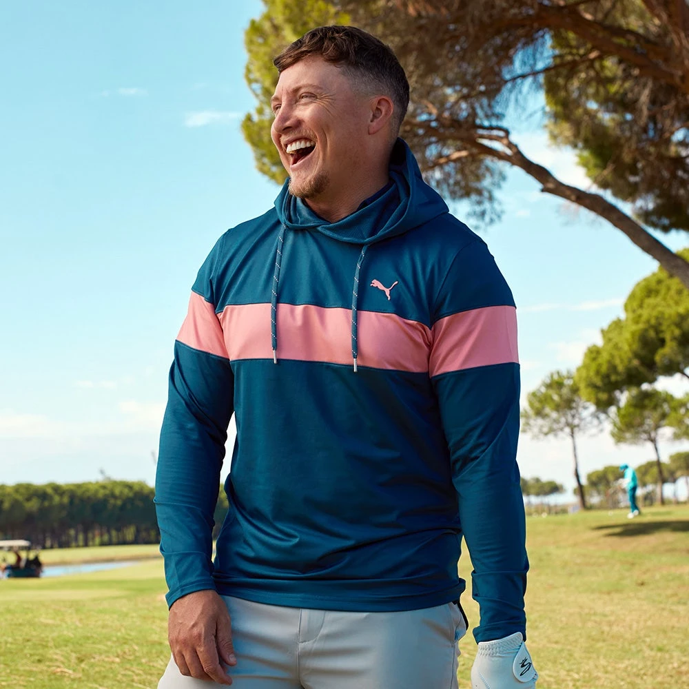 This brand new PUMA Golf mid layer hoodie is another high performance style which is sure to become your favourite layering option this season. The midweight MATTR fabrication has outstanding moisture wicking performance with a dry hand feel – sure to leave you feeling comfortable on the inside regardless of the temperatures you’re up against. The four way stretch allows for unrestricted motion through the golf swing, while the silicone Cat logo is the lightest option available for tour level branding without any compromise. The hood toggles are short in length to avoid distraction, while the hood itself has a mesh lining for structure without the bulk. One of the best golf hoodies in the game – especially in this seasonal colour option.