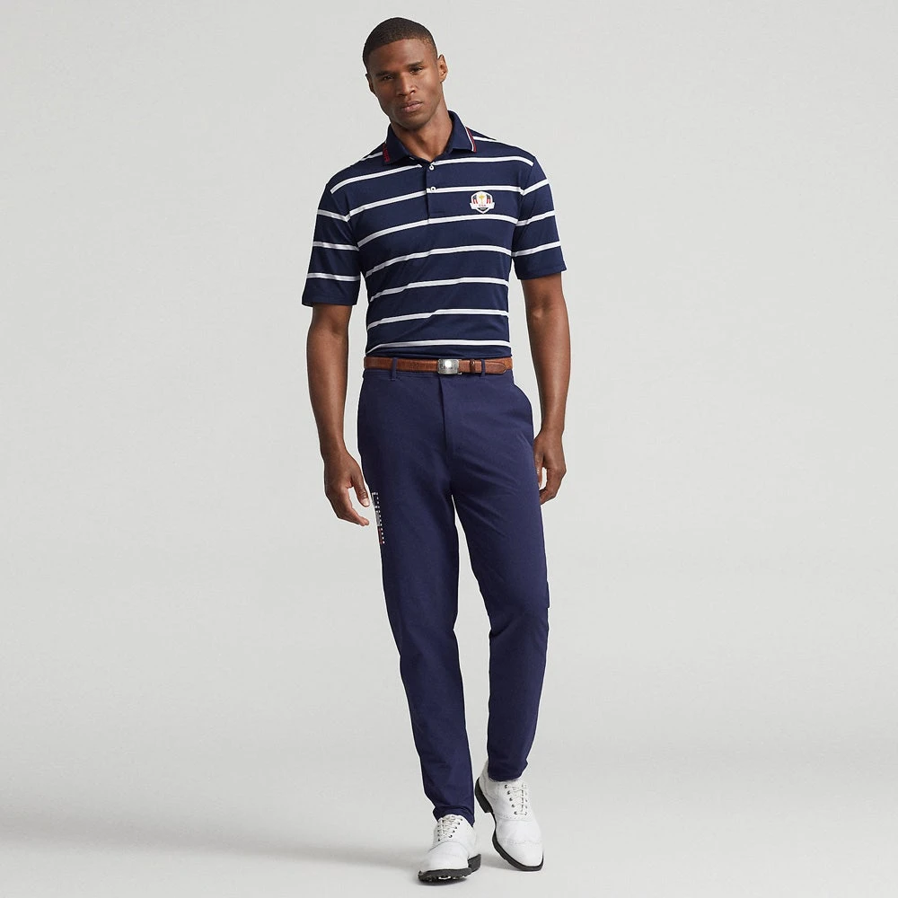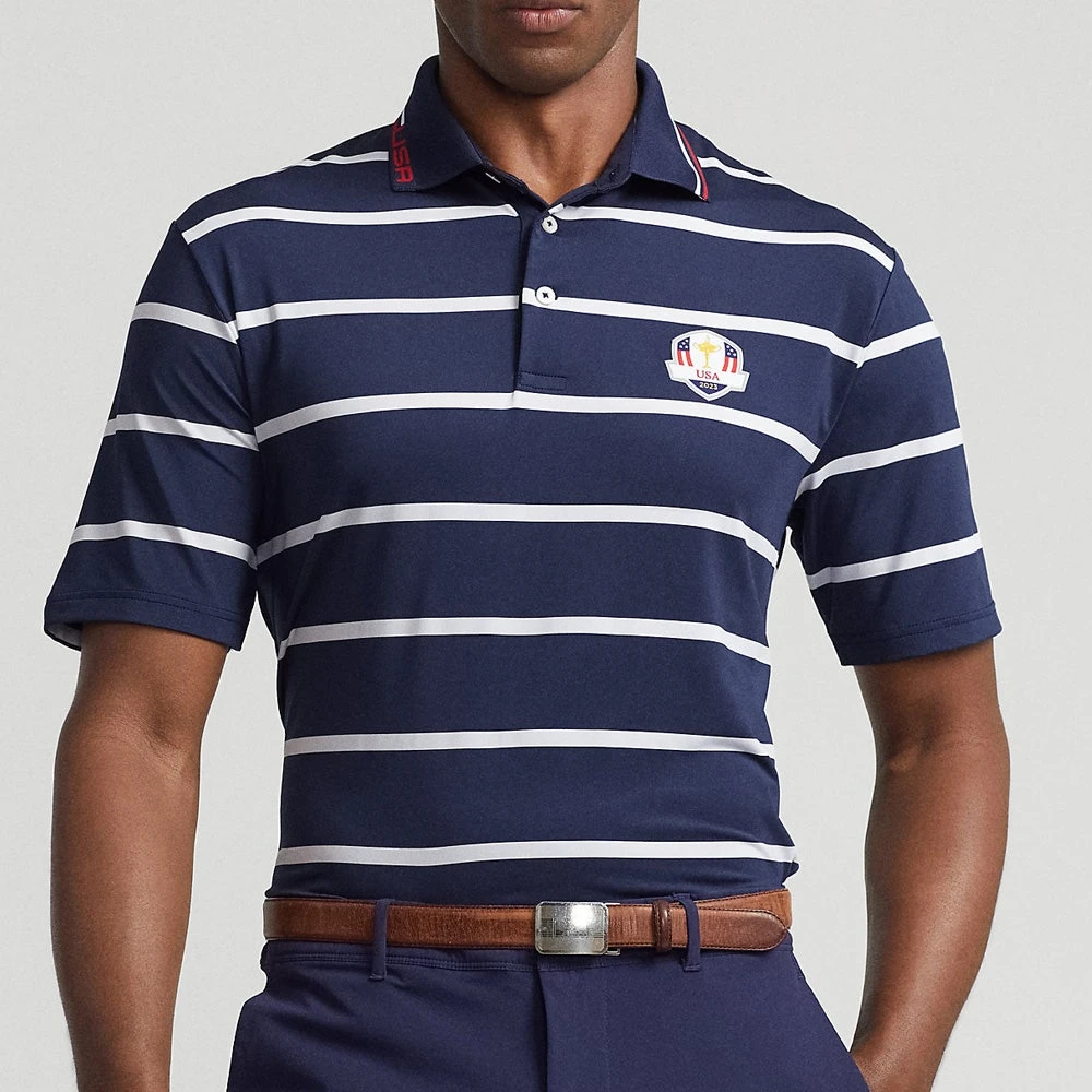 Ralph Lauren are the official outfitters for Team USA at the Ryder Cup 2023 which will take place at Marco Simone Golf & Country Club in Rome, Italy. This particular polo shirt is scripted to be worn by the full Ryder Cup team during the first day of competition on Friday – embracing a navy & white colour palette in true Team USA fashion. It makes use of the tried and tested lightweight “airflow” technology which ensures you will stay cool, dry and comfortable during performance. There is also a high degree of stretch through the fabric to ensure maximum freedom of movement, while the rib knit collar is sure to withstand the test of time. RLX polo shirts are up there with the best in the game and we can’t wait to see Team USA wearing this style on Ryder Cup Friday.